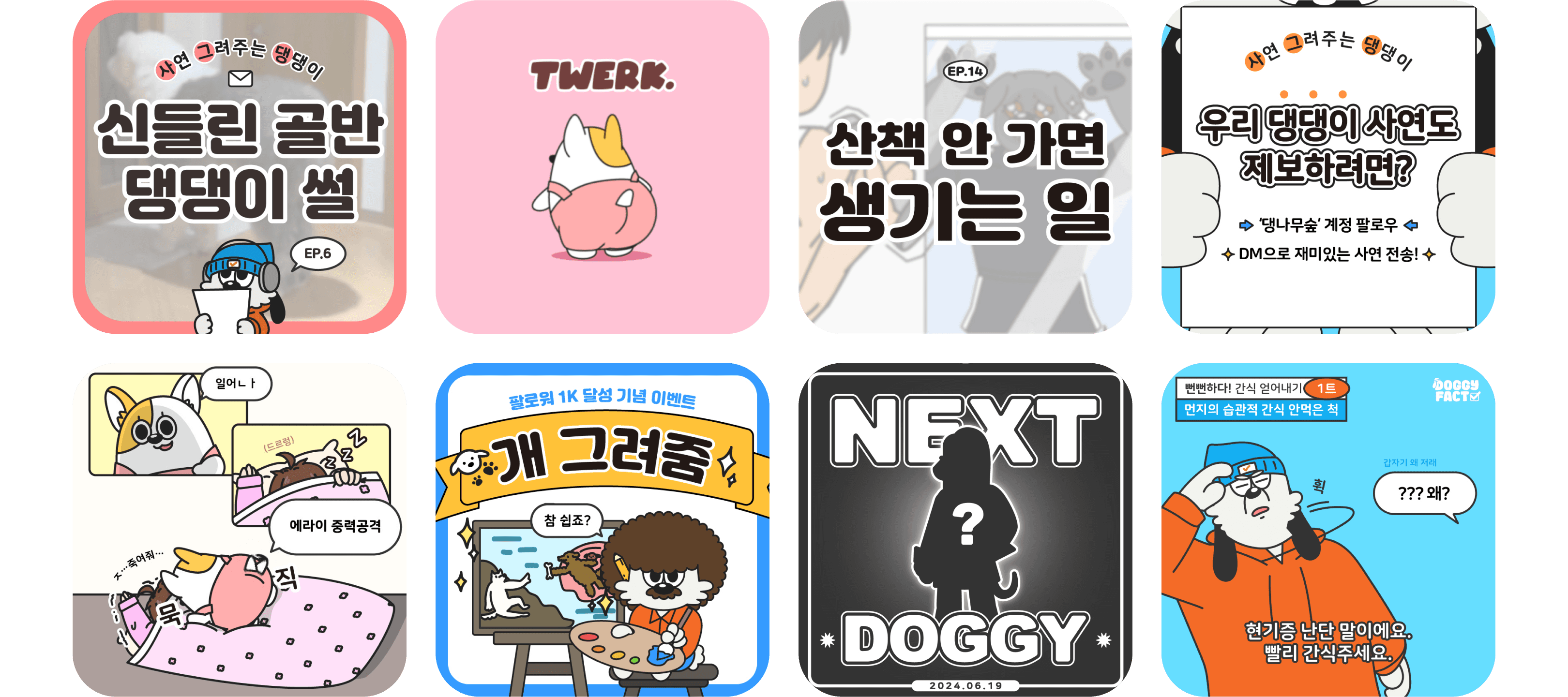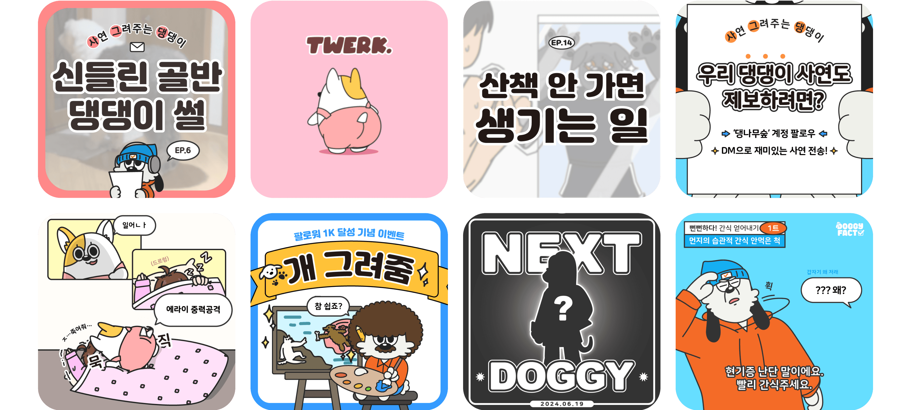 댕나무숲은 캐릭터들을 통해 고객과 소통합니다. 각 캐릭터들은 우리의 브랜드를 대표해 친근하면서 전문적인 이미지로 활동하며, 잠재 고객들에게 다양한 반려견 관련 정보를 재미있고 이해하기 쉽게 전달하는 역할을 합니다.