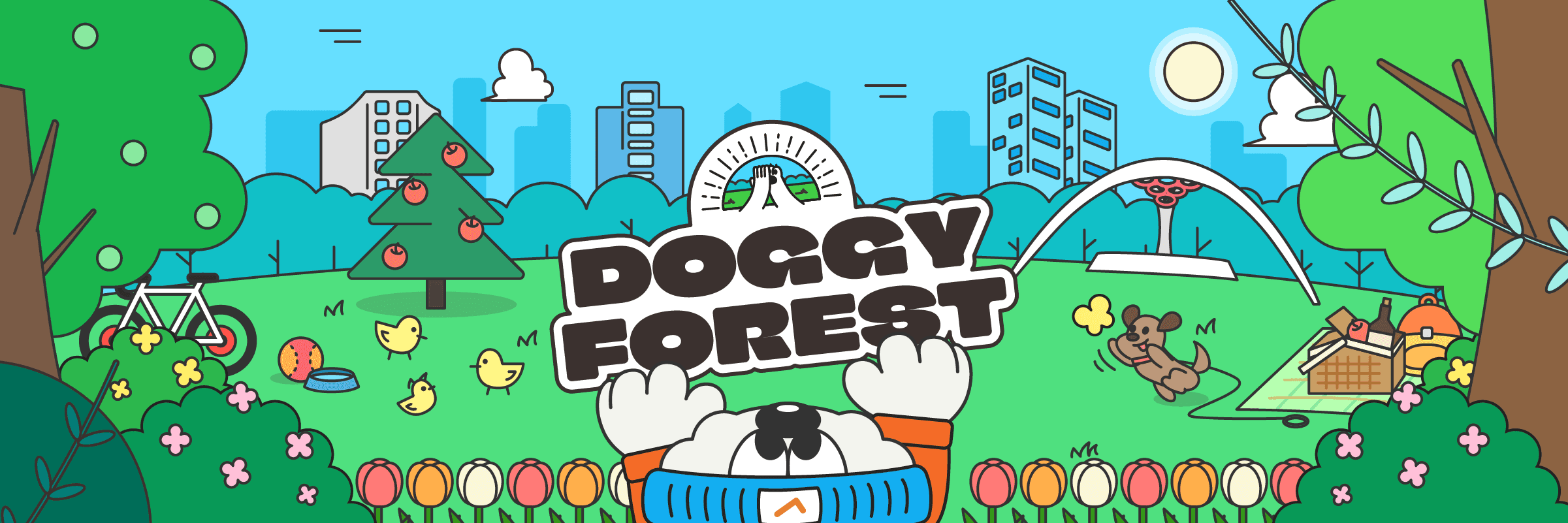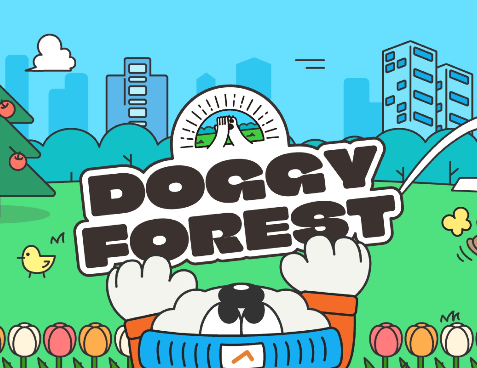 <댕나무숲>은 댕댕이와 대나무숲의 합성어로, 도심 속에 자연이 잘 조성되어 있는 공원입니다. 댕나무숲에는 도기(DOGGY, 개)와 지기(JIGGY, 사람)들이 있습니다.